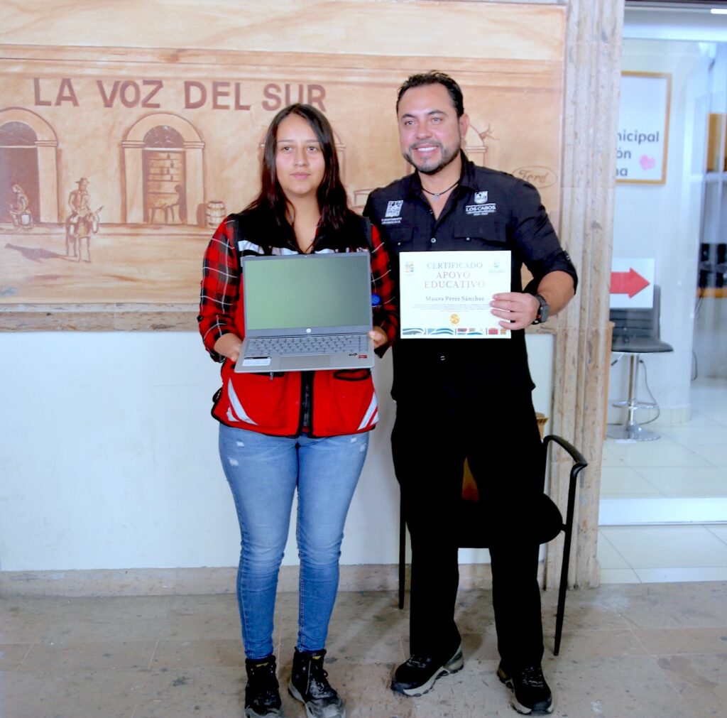 Posteriormente, el presidente municipal hizo entrega de una computadora portátil a la estudiante Maura Pérez, cuya solicitud fue atendida luego de ser expuesta durante una transmisión en vivo realizada por el propio alcalde, dando seguimiento puntual y respuesta directa a su petición.