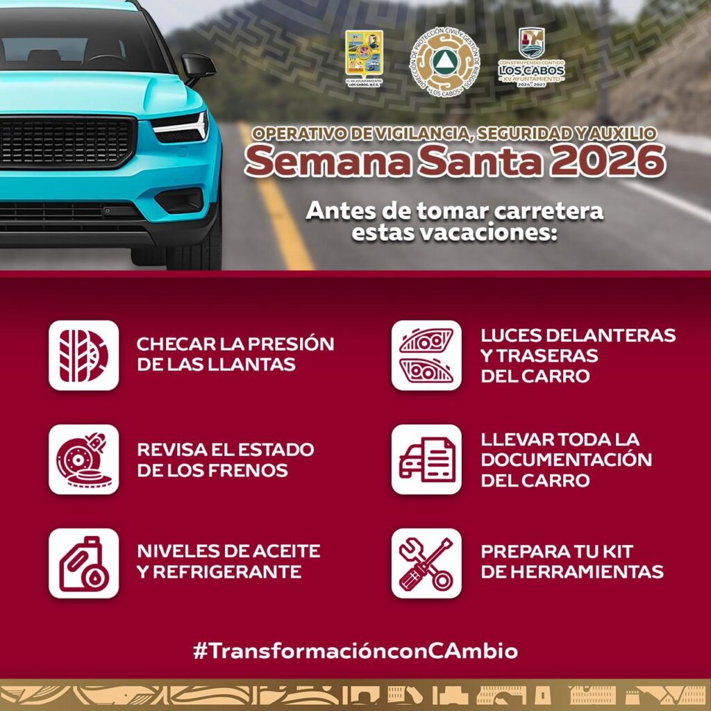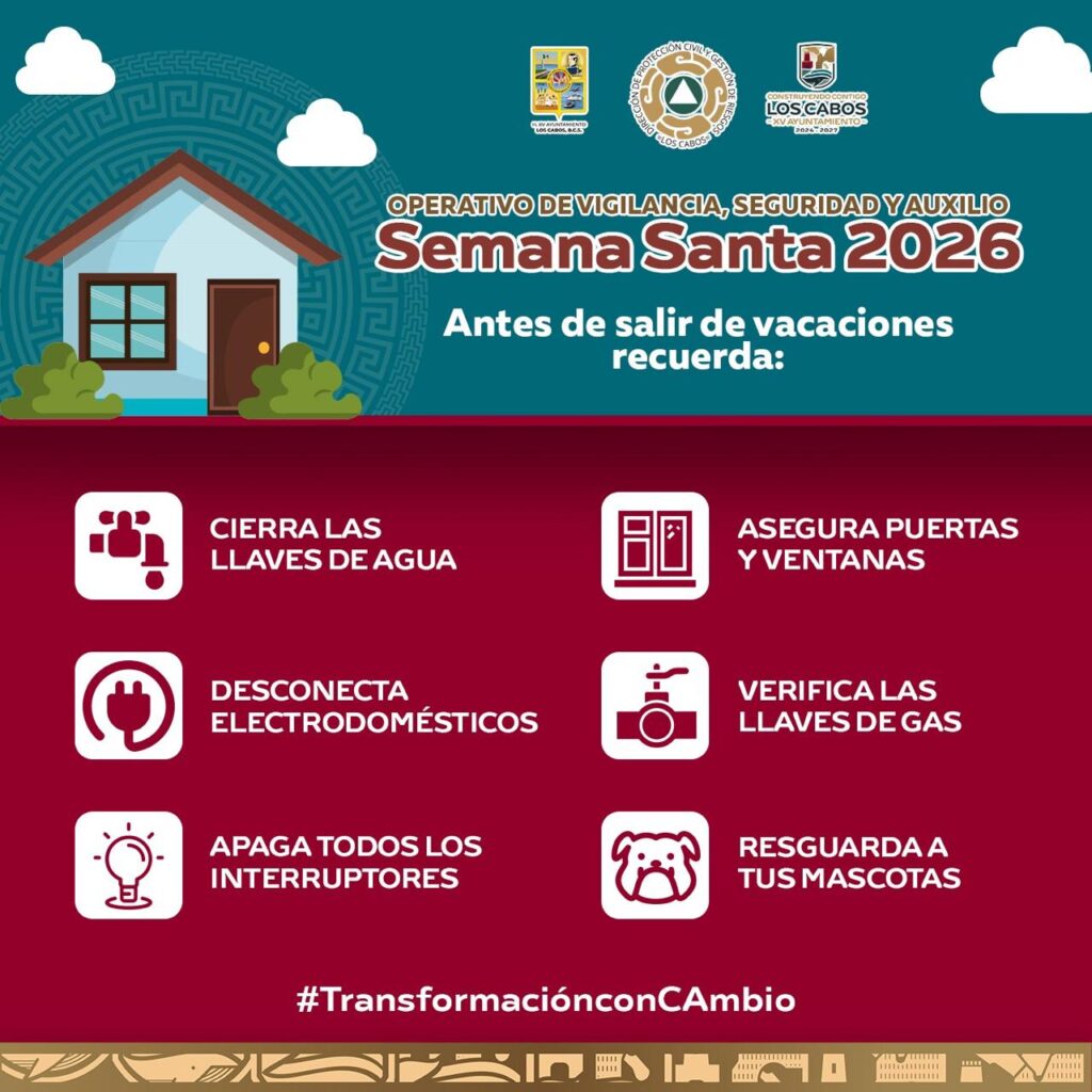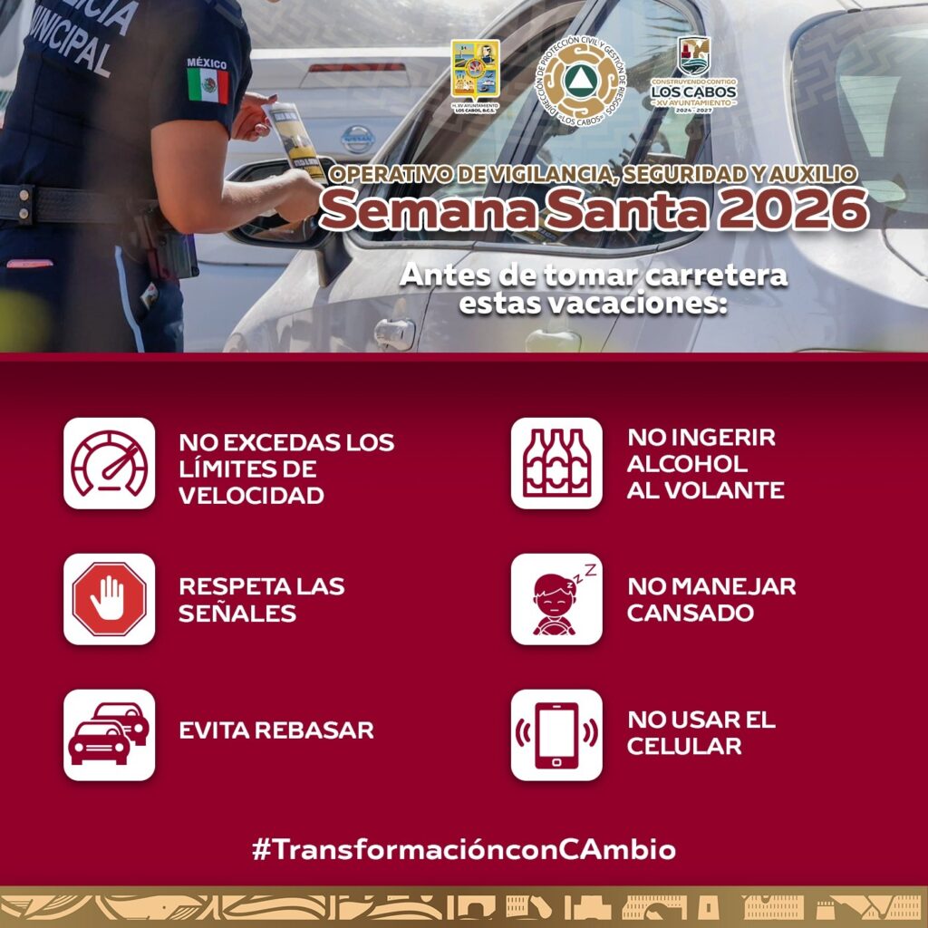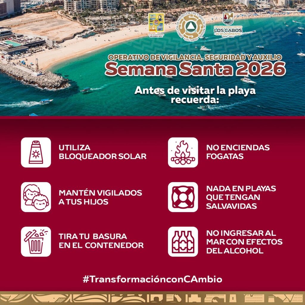Los Cabos, Baja California Sur.– Con el objetivo de prevenir riesgos y salvaguardar la integridad de la ciudadanía durante el periodo vacacional, el XV Ayuntamiento de Los Cabos, a través de la Dirección Municipal de Protección Civil y Gestión de Riesgos, emitió una serie de recomendaciones dirigidas a residentes y visitantes en el marco del operativo “Semana Santa 2026”.